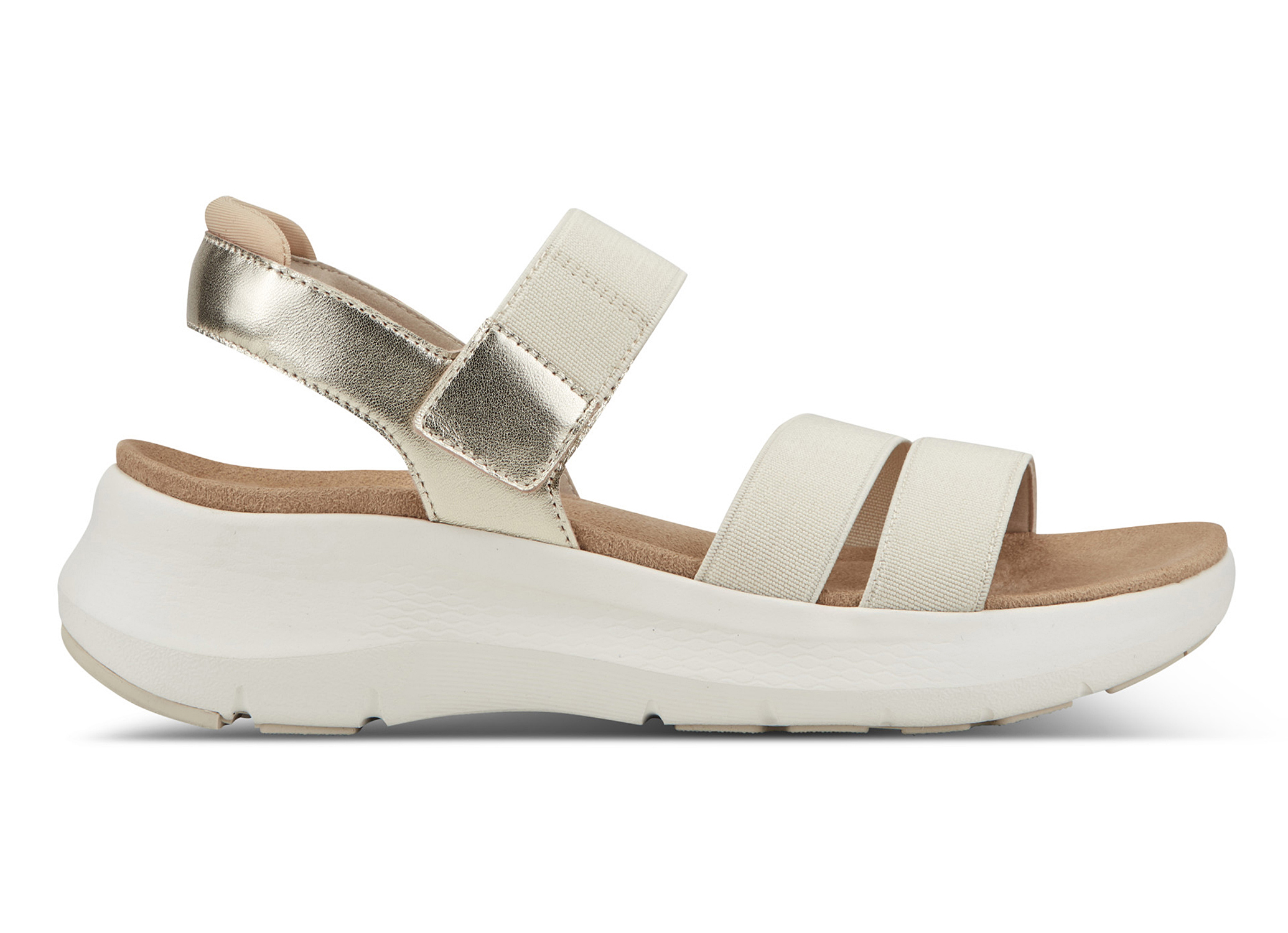 「QUARTS(クオーツ)」は、スポーティなデザインと、極上の履きやすさを兼ね備えたサンダルです。夏のレジャーからタウンユースまで幅広く活躍します。アッパーストラップは、伸縮性のあるゴム(エラスティック)素材を全面に採用し、足の形に合わせてゴムが伸縮するため、一日中足に優しくフィット。留め具のバックルがないため、サッと脱ぎ履きできるストレスフリーな仕様も魅力です。ボリューム感のあるホワイトの厚底ソールは、トレンド感を演出するだけでなく、脚長効果によるスタイルアップも叶えます。柔らかく弾力性のあるEVA素材を使用したActivsoleを採用しており、見た目のボリュームに反して軽量で、安定感も抜群です。さらに、かかと部分には衝撃吸収素材「truTECH(トゥルーテック)」を搭載。厚底のクッション性と相まって、地面からの衝撃をしっかりと吸収し、長時間歩いても疲れにくい設計に。デニムやワイドパンツなどのカジュアルスタイルはもちろん、ロングスカートの外しアイテムとしても活躍する、夏のアクティブシーンに欠かせない一足です。